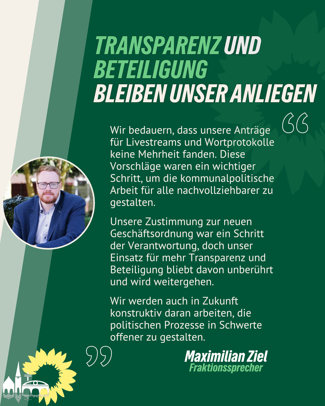 Beide Vorschläge zielten darauf ab, die kommunalpolitische Arbeit für Bürger*innen nachvollziehbar und zugänglich zu gestalten. „Wir haben unsere Vorschläge wie vereinbart eingebracht und respektieren die Entscheidung des Rates. Gleichzeitig hätten wir uns eine intensivere inhaltliche Auseinandersetzung gewünscht. Gerade bei Themen, die die Beteiligung der Stadtgesellschaft betreffen“, erklärt Maximilian Ziel, Sprecher der Grünen Fraktion.